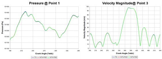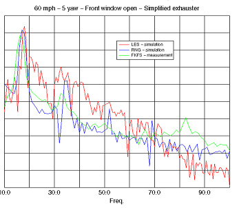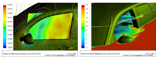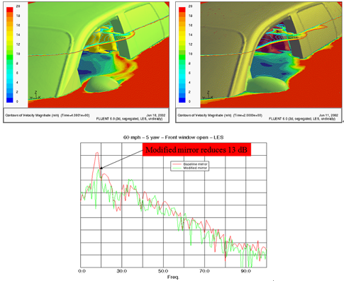 克萊斯勒使用ANSYS Fluent的CAA模型,對(duì)比了兩款不同的后視鏡造型在側(cè)窗打開(kāi)時(shí)駕駛員和乘客的左右耳感受到的氣動(dòng)噪聲?! ?/p>
